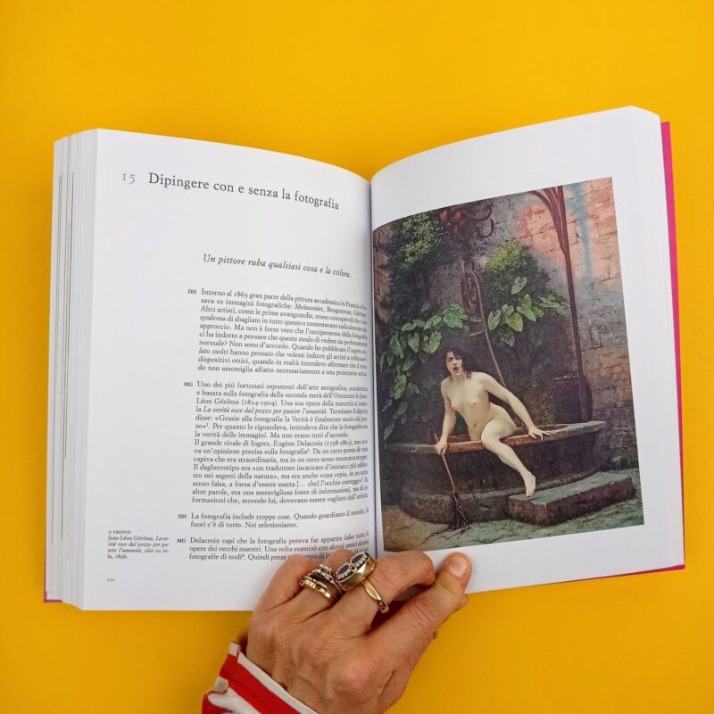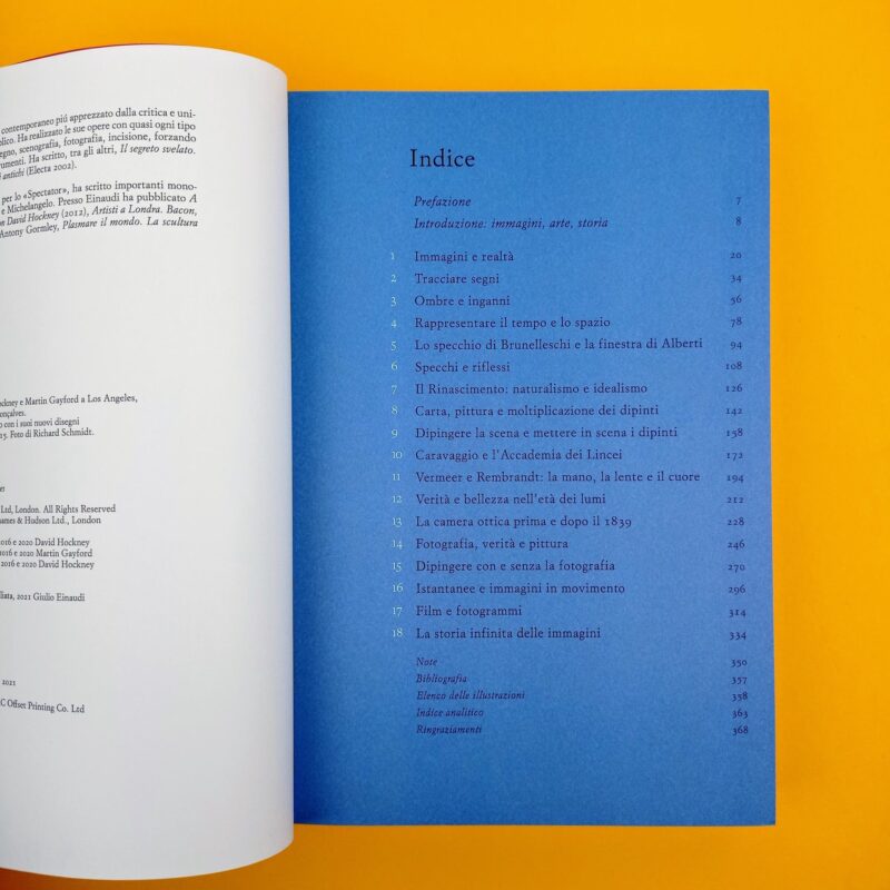 Creare un’immagine, sostiene Hockney, è l’unico modo che abbiamo a disposizione per dar conto di ciò vediamo. Ma tutti coloro che producono immagini si confrontano con lo stesso problema: come comprimere persone, cose e luoghi tridimensionali su una superficie piatta? I risultati vengono spesso catalogati come pitture, fotografie o film, per poi essere ordinati secondo epoche e stili. Ma di fatto, che siano prodotti con un pennello, un apparecchio fotografico o un programma digitale, che siano sulle pareti di una caverna o sullo schermo di un computer, sono innanzitutto delle immagini. E a noi, per capire in che modo vediamo il mondo – e quindi per capire anche noi stessi – serve una storia delle immagini. Insomma, questo libro. Dopo una vita dedicata a dipingere, a disegnare o a produrre immagini con apparecchi fotografici, Hockney, in collaborazione con il critico Martin Gayford, possiede tutti gli strumenti necessari per esplorare come e perché nel corso dei millenni siano state prodotte delle immagini. Cos’è che rende interessante dei segni su una superficie piatta? Come viene reso il movimento in un’immagine immobile o, viceversa, cosa lega i film e la televisione agli antichi maestri della pittura? Come condensare il tempo e lo spazio in un’immagine statica, su una tela o su uno schermo? Quello che un’immagine ci mostra è una verità o una menzogna? Le fotografie rappresentano il mondo per come ne facciamo esperienza? Mettendo a confronto una grande varietà di immagini – un fotogramma di un cartone animato di Disney con una stampa di Hiroshige, una scena di un film di Ejzenstejn con un dipinto di Velazquez – gli autori superano le convenzionali frontiere tra cultura alta e bassa, operando inaspettati collegamenti tra epoche, luoghi e tecniche espressive diversissime. Perché per Hockney, film, fotografia, pittura e disegno sono sempre profondamente connessi gli uni con gli altri. Acuto e provocatorio, questo libro contribuisce in modo autorevole a renderci consapevoli del modo in cui rappresentiamo la realtà che ci circonda.