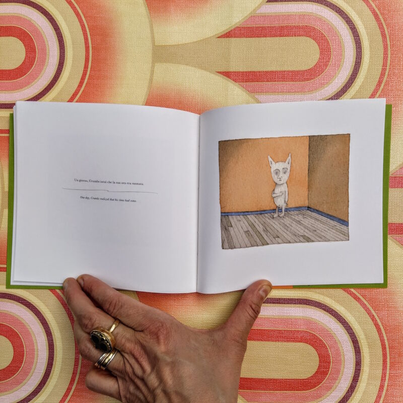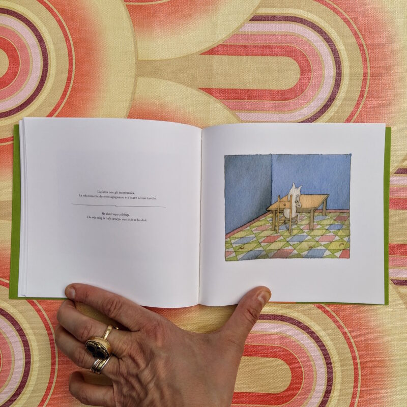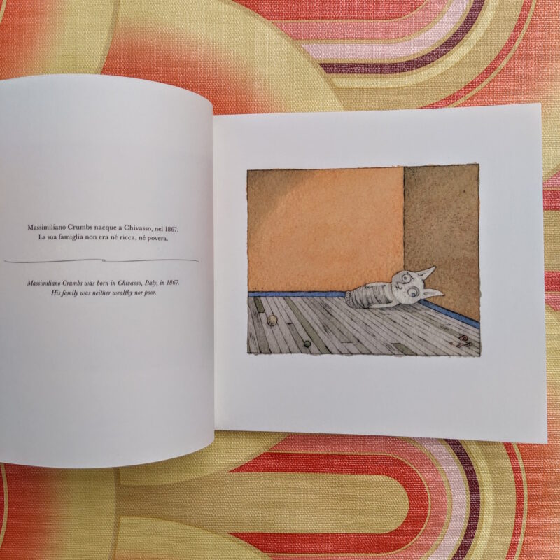 Una vita di solitudine, ore passate solo al tavolo da disegno, senza preoccuparsi della fama e senza mai smettere di pensare. Una storia tragica sul destino dell’artista, che si trasforma in sorriso grazie agli acquerelli leggeri di Ruzzier e ai suoi disegni paradossali che spingono il testo all’estremo.