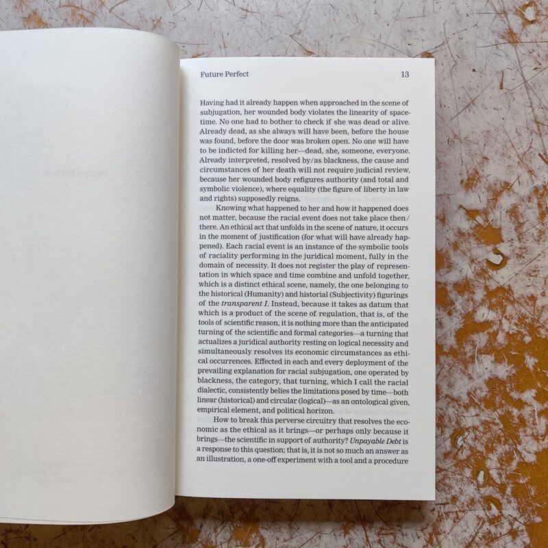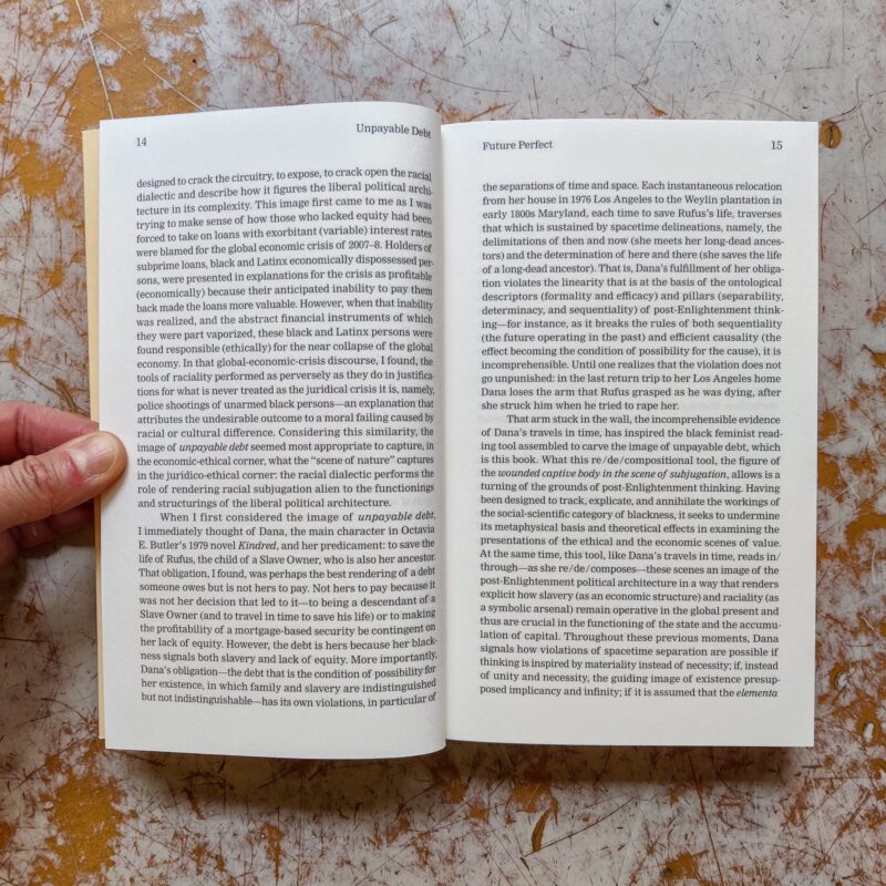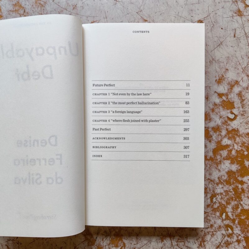 Unpayable Debt examines the relationships among coloniality, raciality, and global capital from a black feminist ?poethical? perspective. Inspired by Octavia E. Butler’s 1979 sci-fi novel Kindred, in which an African-American writer is transported back in time to the antebellum South to save her owner-ancestor, Unpayable Debt relates the notion of value to coloniality?both economic and ethical. Focusing on the philosophy behind value, Denise Ferreira da Silva exposes capital as the juridical architecture and ethical grammar of the world. Here, raciality?a symbol of coloniality?justifies deployments of total violence to enable expropriation and land extraction.