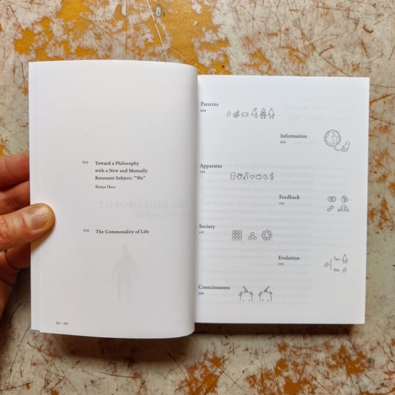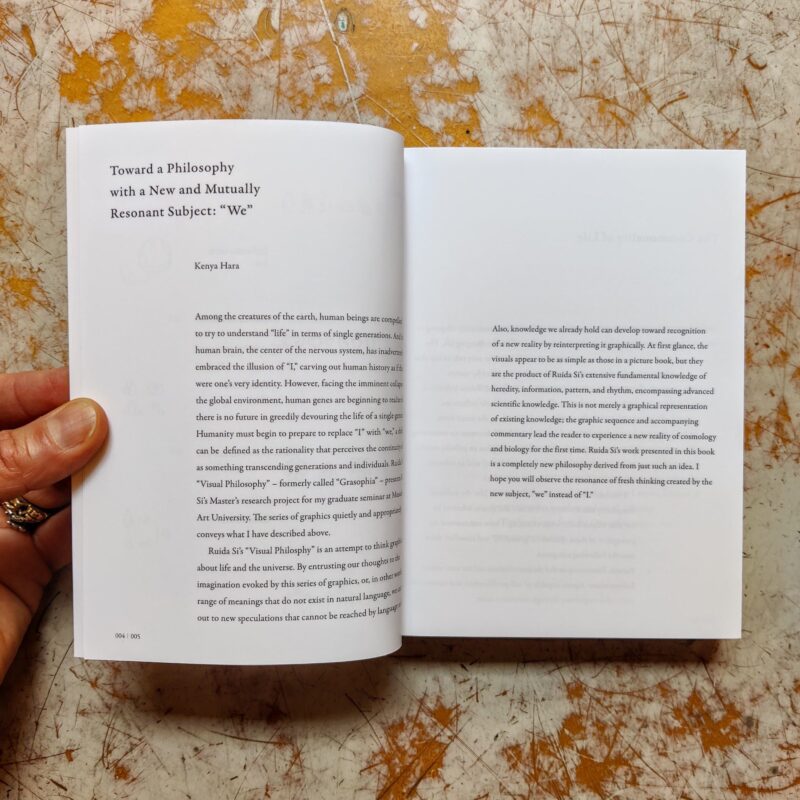 This small but substantial pocket-size book is an attempt to think through life and the universe in graphic-design terms. With concise drawings and brief texts, Japanese illustrator and designer Ruida Si quietly shows humanity in the grip of a dawning realization about its own collectivity. Facing the imminent collapse of the ecosystem, humanity must prepare to replace “I” with “we”–“we” defined in a utopian spirit as a subject transcending generations and individuals.