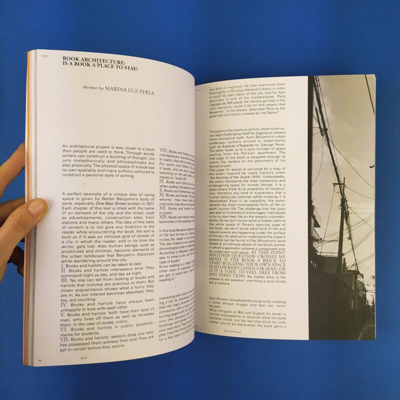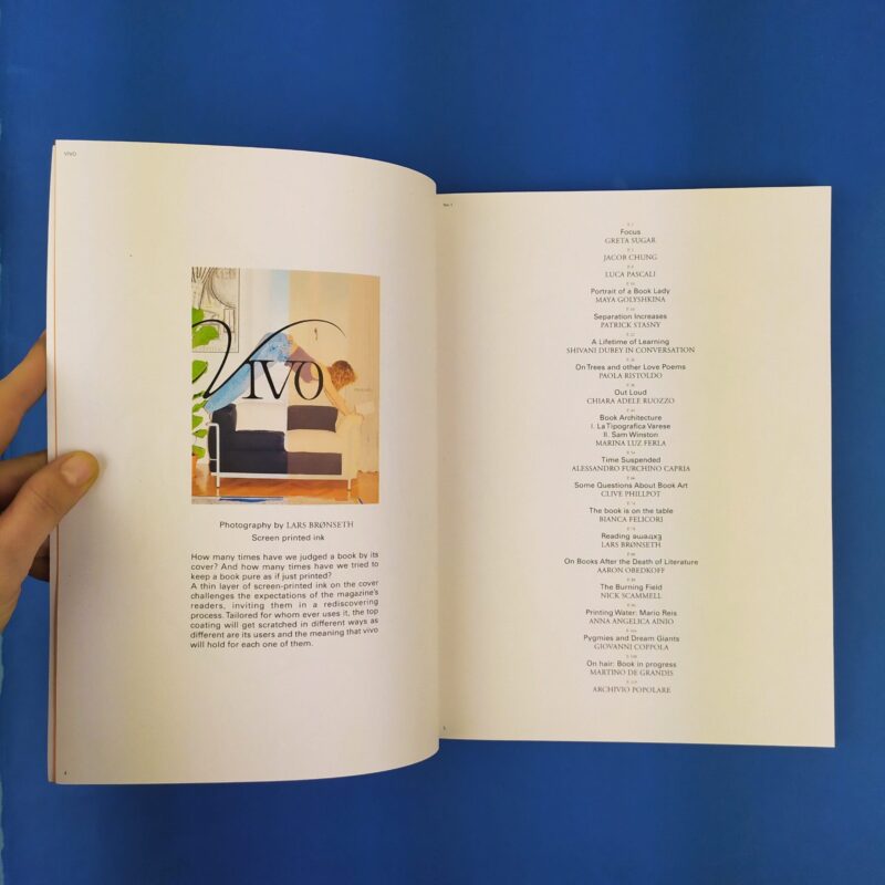 Il libro nella sua forma fisica è un oggetto che ci costringe a fermarci, richiedendo un coinvolgimento attivo da parte nostra – sappiamo quanto possa essere scomodo leggere. Il primo numero di Vivo indaga il libro come oggetto, qualcosa di così familiare e presente nella vita di ognuno che sembra quasi inutile parlarne, eppure con la sua sola presenza riesce sempre a creare una sorta di antropologia universale. Vivo utilizza i libri e la carta stampata per osservare frammenti di umanità che convivono in ogni tempo – nel presente, nel passato e nel futuro. Da qui la scelta di ricoprire la copertina con una patina arancione che può (deve!) essere graffiata, vissuta, senza preoccuparsi di rovinare il magazine, ma anzi considerando ogni graffio come segno di apprezzamento della lettura che si sta facendo.