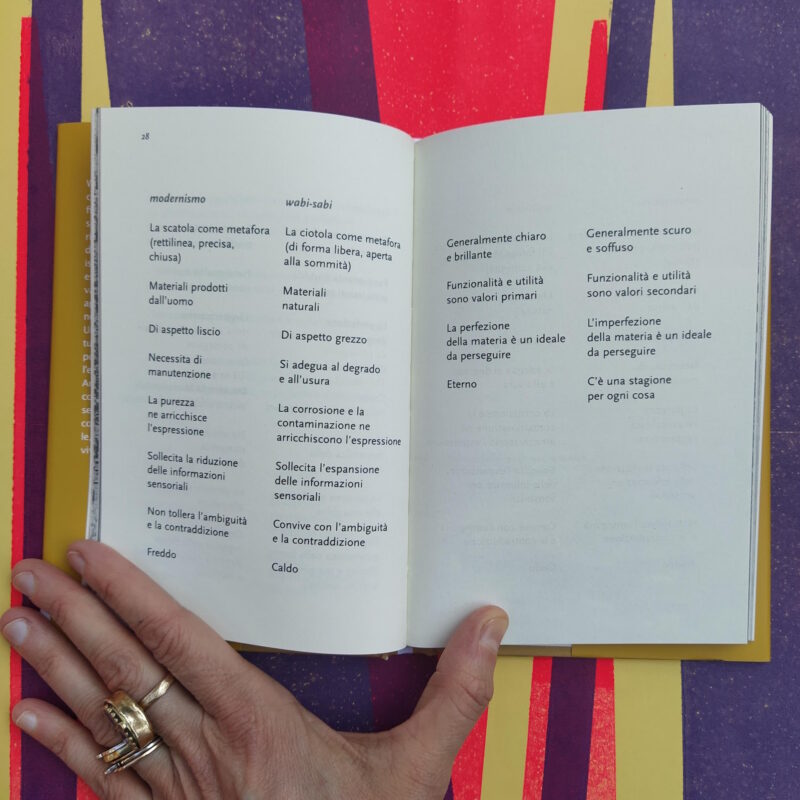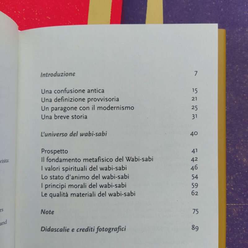 il grunge, o come si chiamerà il prossimo». «L'universo del wabi-sabi Fondamento metafisico - Le cose regrediscono verso il nulla, o si evolvono da questo Valori spirituali - La verità deriva dall'osservazione della natura - I dettagli trascurati o poco appariscenti possiedono una loro grandezza - Da ciò che è brutto i può ottenere il bello Stato d'animo - Accettare l'inevitabile - Apprezzare l'ordine del cosmo Precetti morali - Sbarazzarsi di tutto ciò che è superfluo - Concentrarsi sugli aspetti essenziali, ignorando la gerarchia materiale Qualità materiali - Evocazione di un processo naturale - Irregolarità - Intimità - Modestia - Grossolanità - Indeterminatezza - Semplicità»