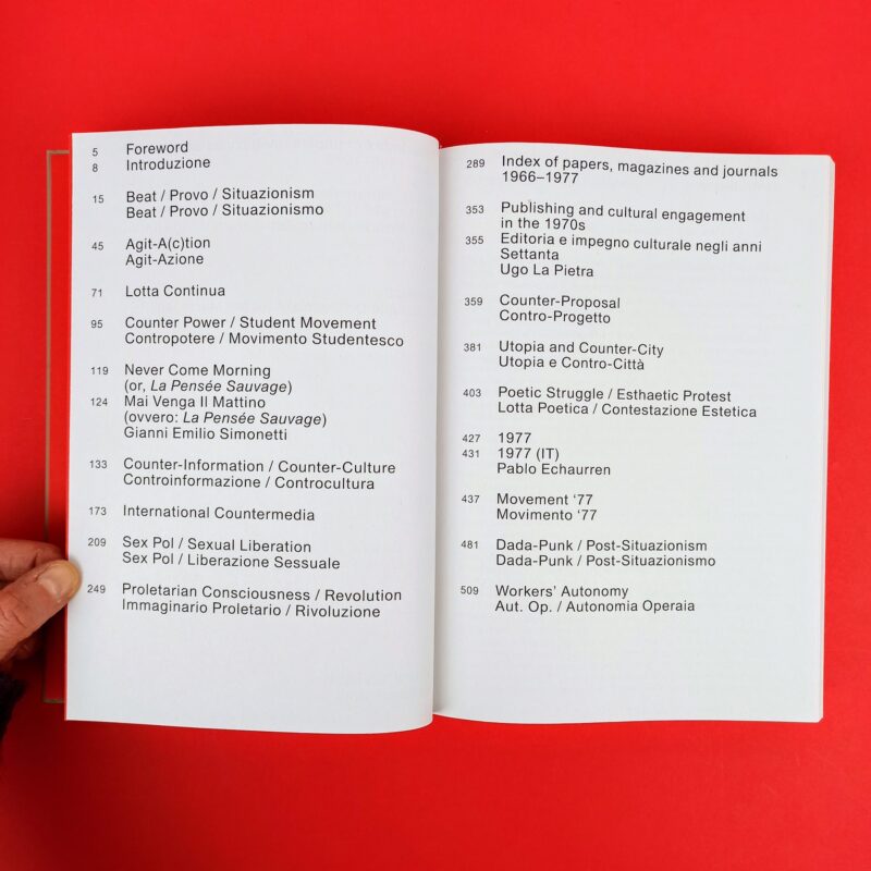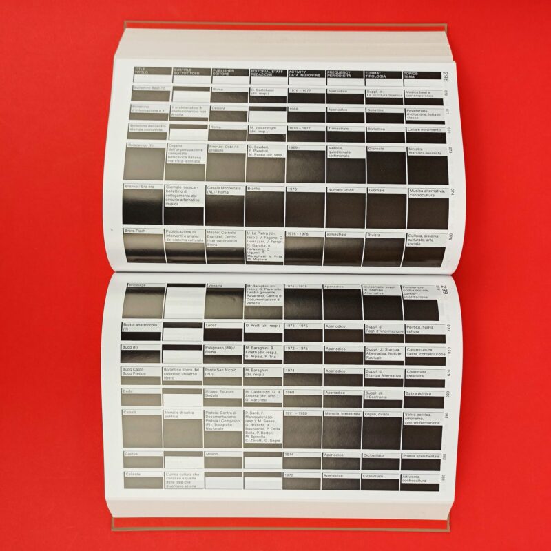 in foglio, giornale, rivista, ciclostilato, bollettino, fascicolo, alcuni quotidiani altri periodici, spesso irregolari, altri aperiodici di cui molti numeri unici in reiterata attesa di autorizzazione… La febbrile attività tipografica si lega alla serrata politico-ideologica, antagonista e contro-culturale di un periodo di lotta, conquista di spazi civili, aree di libertà e di creatività sociale. In questo volume si censiscono e selezionano criticamente più di 600 stampati usciti tra il 1966 e il 1977. Questa ricerca è la continuazione naturale della corposa pubblicazione, uscita nel 2014 ed edita dagli stessi editori: Yes Yes Yes, Alternative press, 66-77 from Provo to Punk, curata da Emanuele De Donno ed Amedeo Martegani. Quel primo volume esaminava il ruolo della stampa alternativa, underground e controculturale europea ed americana in un periodo fiorente: 1966-1977; questa nuova edizione si concentra sulla scena italiana, la cui ampia strategia di “connivenze” e la frastagliata geografia regionale hanno posto la necessità, per sezionare tematicamente il percorso, di dare una visione allargata dei mezzi di stampa alternativa, non solo underground, indipendenti e contro-culturali, ma anche della contro-informazione, della editoria “schierata” ultra-radicale politica quindi ideologica. Il nucleo consistente di testate censite nella prolifica rete italiana che si allarga anche alle province è stata reperita grazie ai contributi di archivi messi in rete, collezionisti, cultori, editori e attivisti da tutta Italia che costituiscono una geografia sommersa dell’editoria contro-culturale italiana ma anche di un collezionismo resistente e ragionato. Questi mezzi stampa documentano una ricerca di cultura radicale, di autori e co-autori, promotori/artisti di cultura libera ed alternativa, distribuita in formati di confine e sperimentali.
