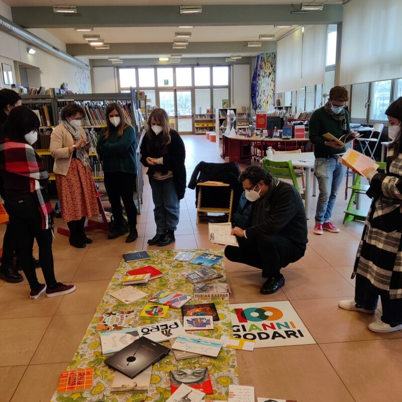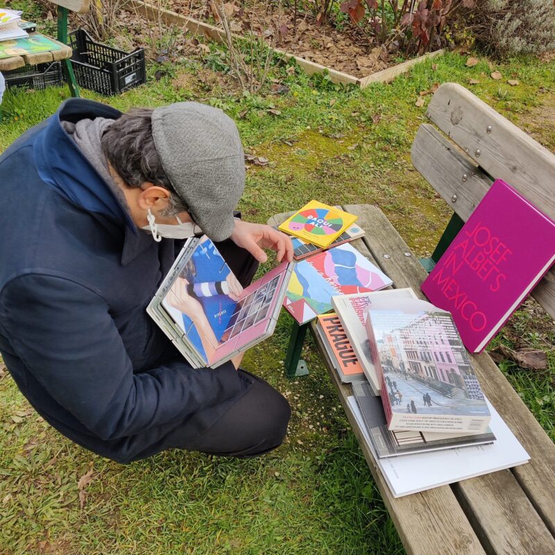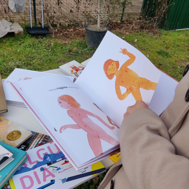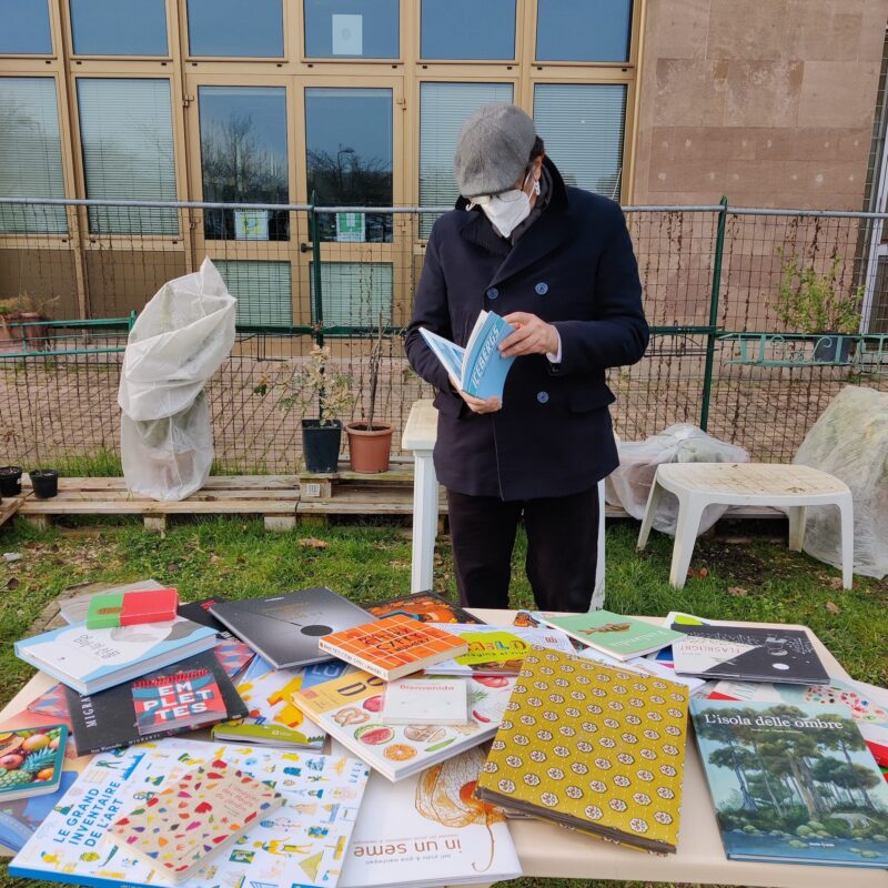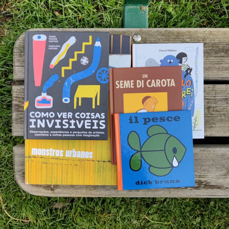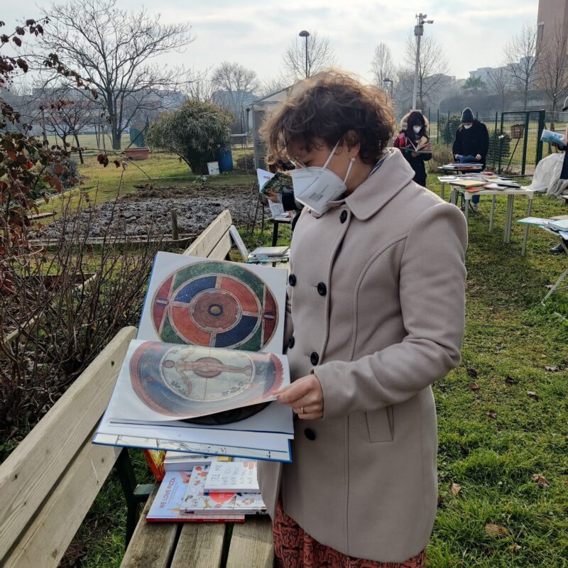 Insieme a un piccolo gruppo di bibliotecari delle area ragazzi di recente formazione e ad alcune bibliotecarie esperte abbiamo sperimentato fisicamente la lettura “fuori” nell’orto della Mediateca, dove abbiamo allestito una fitta giungla di libri illustrati da esplorare in libertà con l’obiettivo di scegliere due libri che “portano fuori”.